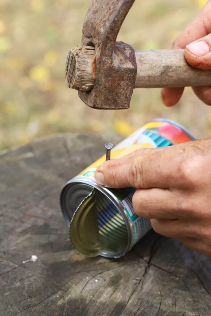Poinçon : utilisez un clou, un poinçon ou tout autre type de poinçon métallique qui peut faire éclater quelques petits trous dans chacune de vos boîtes de conserve. Presque n’importe quel outil en métal pointu peut le faire, mais réfléchissez-y à deux fois avant d’utiliser votre couteau, à moins que vous n’ayez pas d’autre choix, car c’est un excellent moyen d’endommager la pointe.